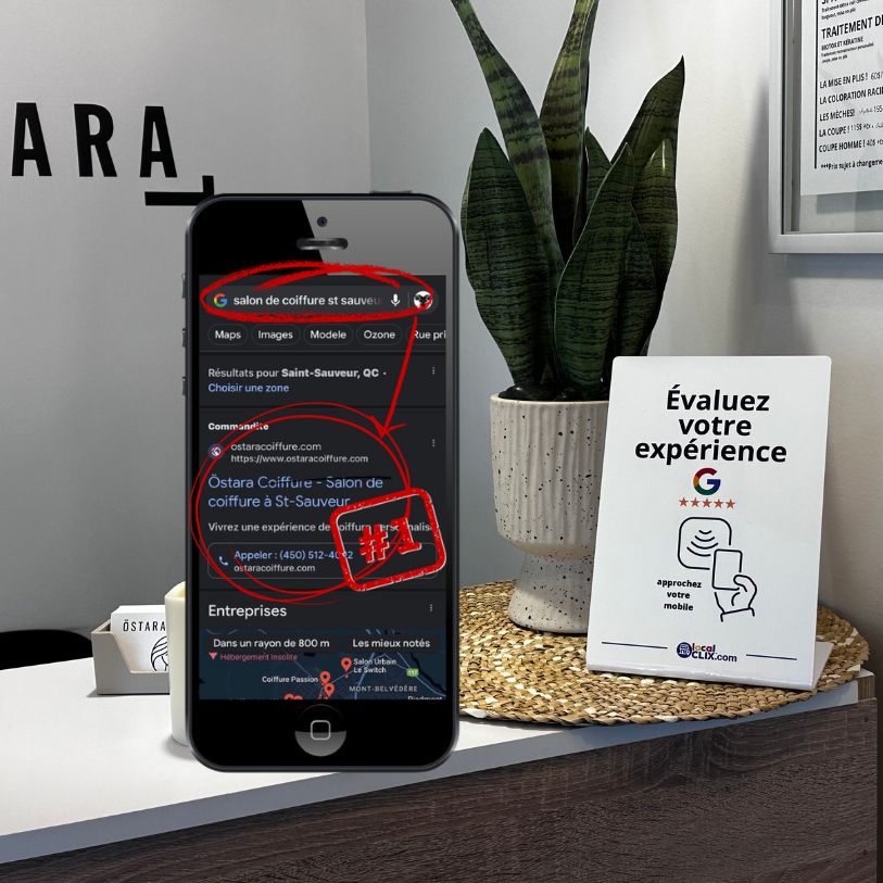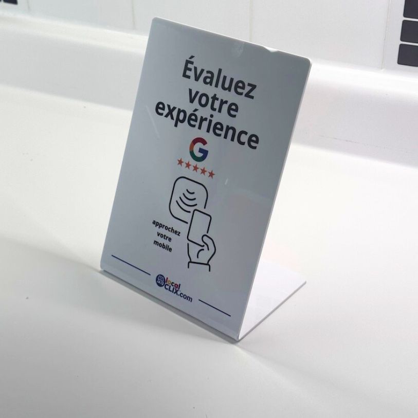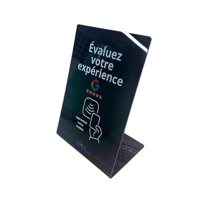 L'accélérateur d'avis utilise la technologie NFC. Il s'agit donc d'une puce intégré au support. Cette puce doit être programmée avec le lien de l'appication qui permet de laisser un avis sur votre profile d'entreprise Google. Cette technologie permet à vos clients de vous laisser un avis en plaçant simplement leur téléphone mobile sur le support. Il s'agit de la même technologie utilisée par Apple Pay et Google Pay.